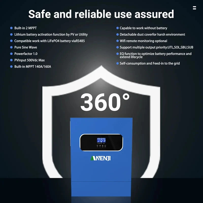 5. Flexible Input & Output: Supports photovoltaic input up to 500Vdc for high - power applications. Works without batteries and supports multiple output priorities (UTL, SOL, SBU, SUB modes).