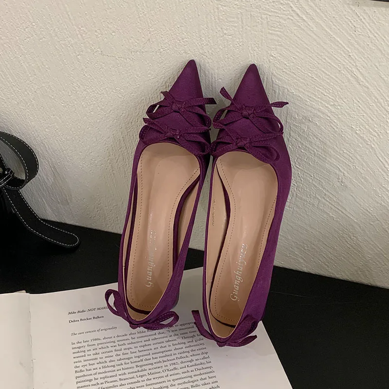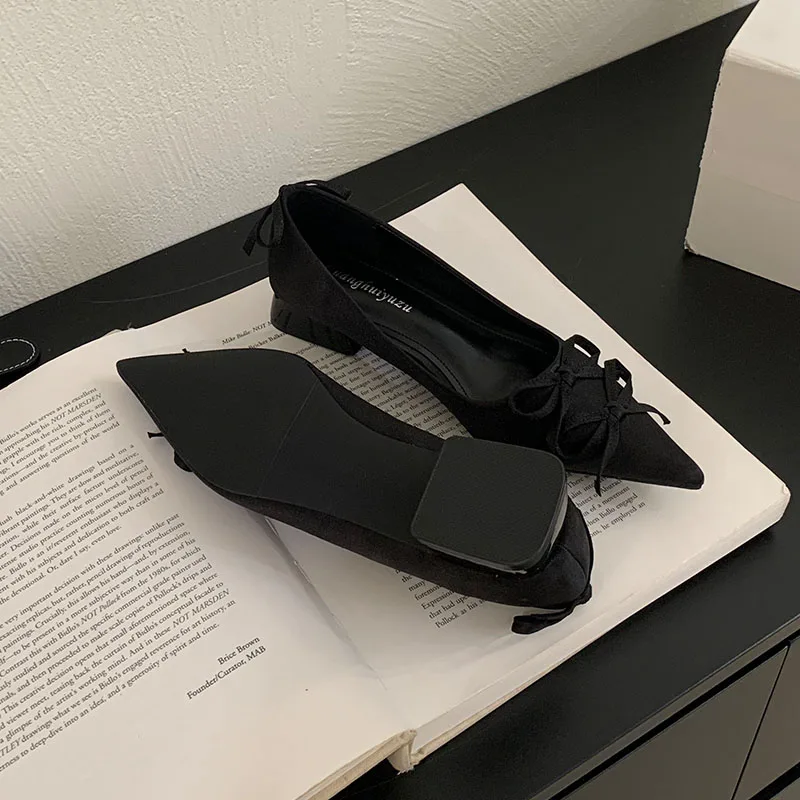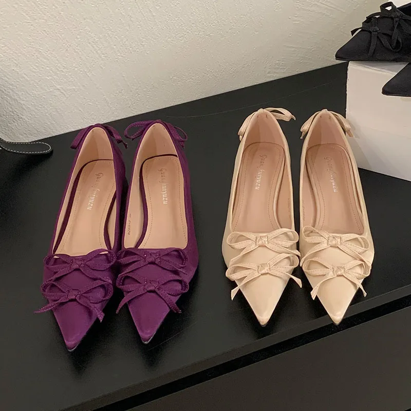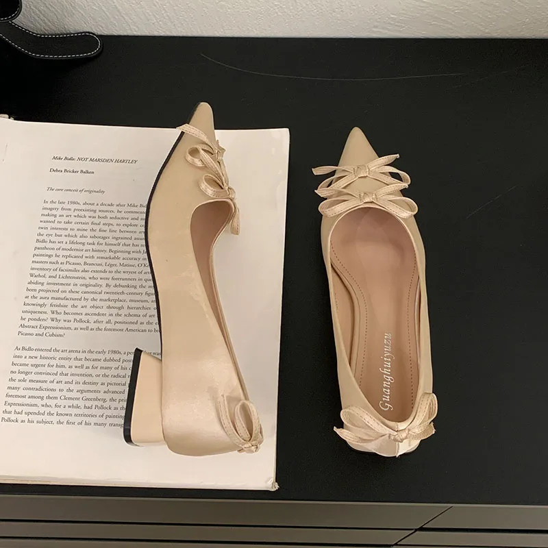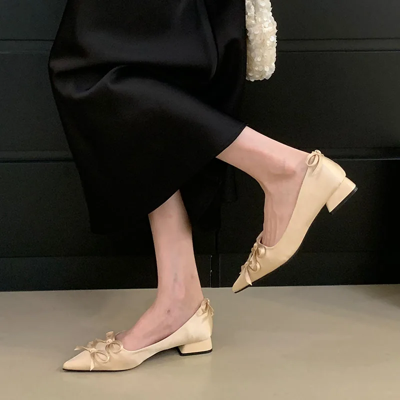 2025 New Fashion Silk Shallow Women Low Heel Shoes Butterfly-Knot Female Slip On Footwear Pointed Toe Ladies Heels Pumps Shoes