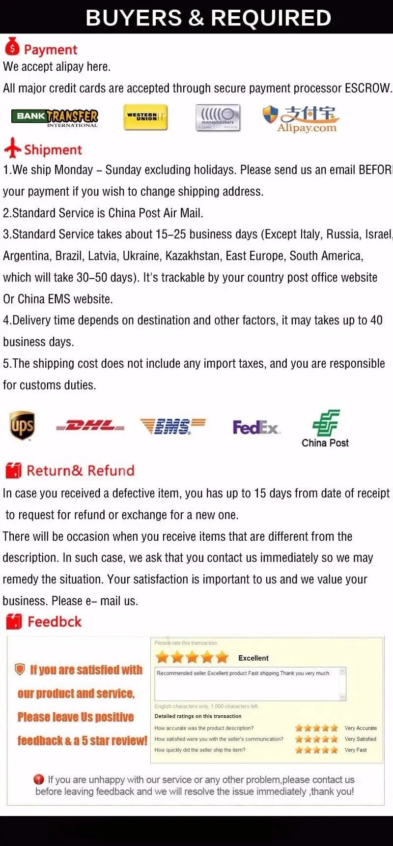 We will leave POSITIVE FEEDBACK after receiving the payment. Please contact us if you are not satisfied with the item after receiving it.
