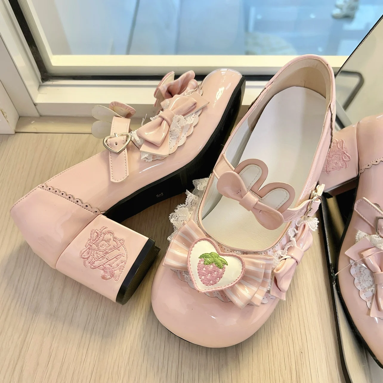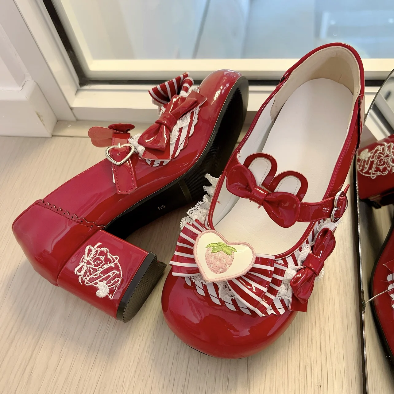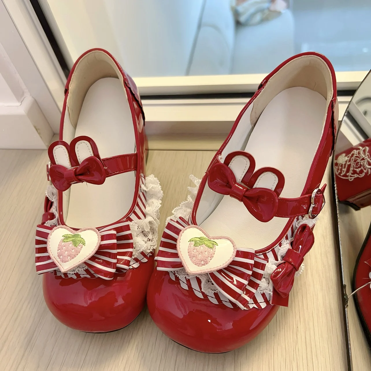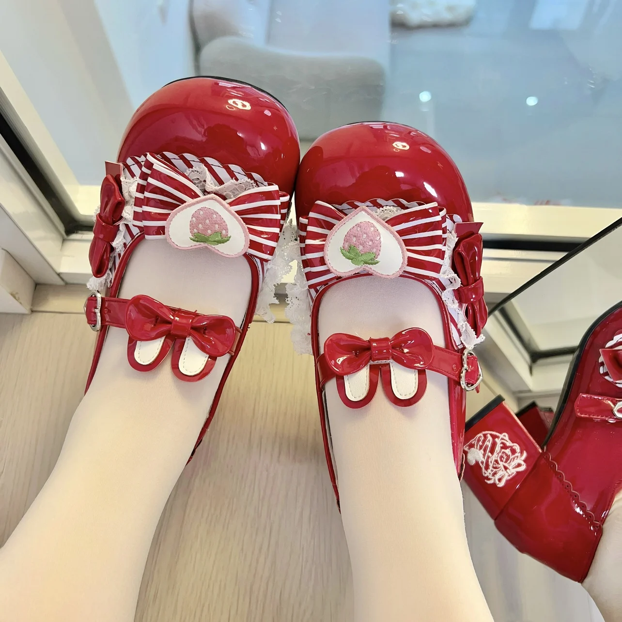 Original Sweet Strawberry Bow Cute Girl Lolita Shoes 2025 New Kawaii Princess Mary Jane Shoes Temperament Women's High Heels