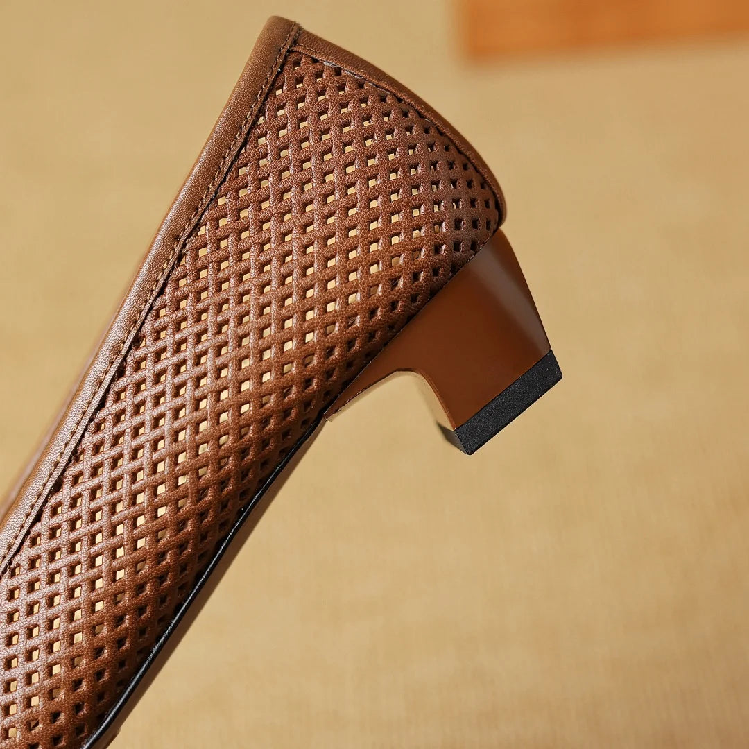 Plus size 34-41 women's hollow-out sheepskin slip-on summer breathable pumps metal toe 3cm kitten heel elegant ladies heels shoe